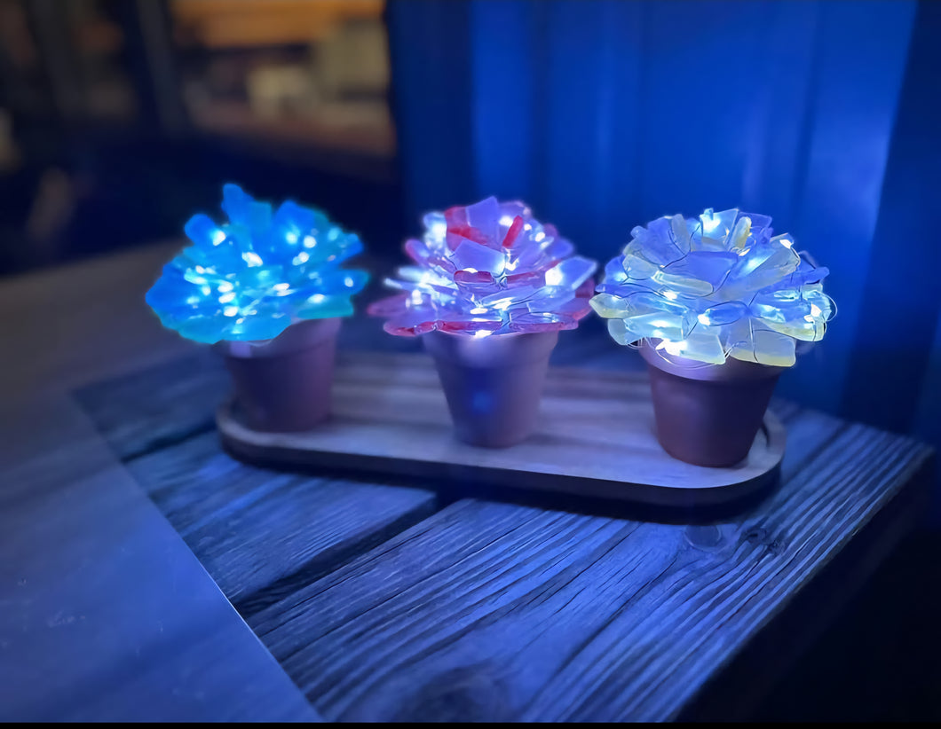 We offer a variety of Trees, Gnomes, and Succulents. We will have an assortment of sea glass colors available that you will select at the workshop.